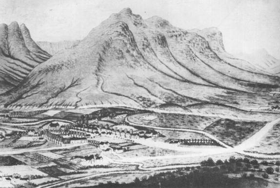Panorama van die dorp Stellenbosch in die jaar 1776 / Panorama of the town Stellenbosch in the year 1776.